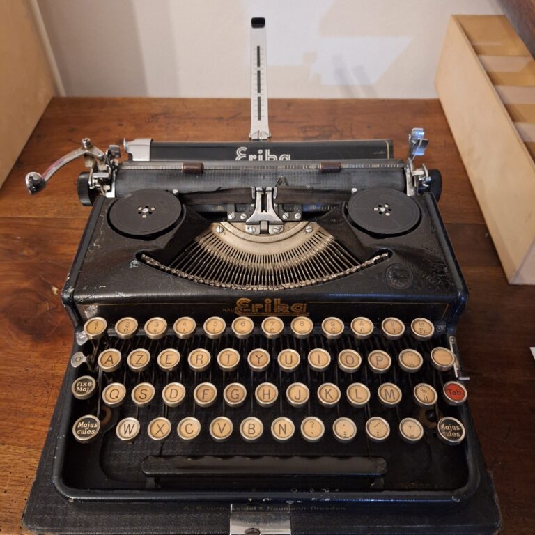 De lui j’ai gardé cette machine à écrire Erika produite à Dresde par Seidel & Naumann à la fin des années 1920. C’était un des premiers modèles portables européen. La machine voyage dans une valise en cuir et était très prisée par les étudiants, écrivains et… secrétaires. Elle était réputée pour sa frappe nette et sa mécanique fine. Elle avait de fort belles touches en verre cerclées d’acier. On a pu dire que le son des Erika des années 1920 était l’un des plus harmonieux des machines européennes.